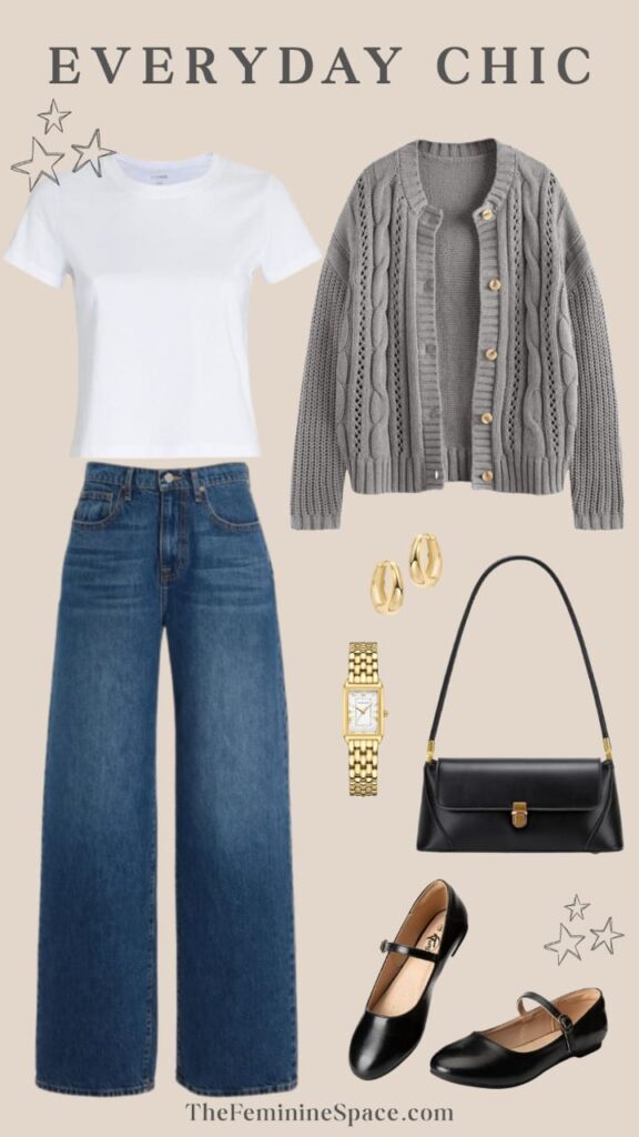 A simple white tee with a grey cardigan is the kind of combo you’ll wear on repeat, especially with wide leg jeans and dainty gold accessories. Ballet flats and warm socks pull it all together for a sweet, cozy finish