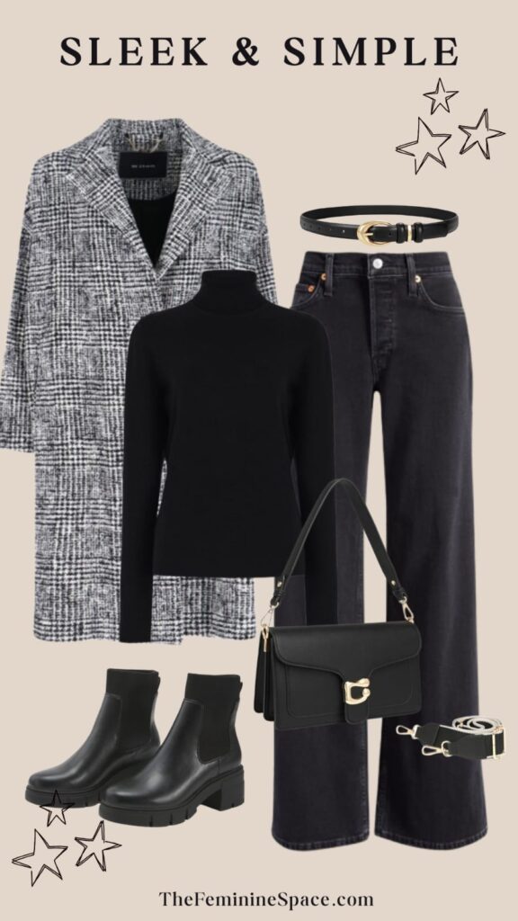 The black turtleneck and wool coat are a dynamic couple: chic, warm, and forever fashionable. Wide leg jeans provide a trendy touch, while Chelsea boots and a crossbody bag are practical and adorable.