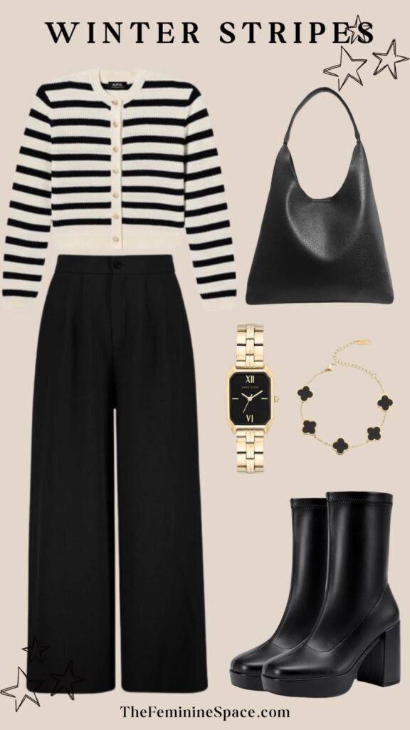 This outfit is the epitome of comfort and sophistication with a striped cardigan and black pants. Top it off with a hobo bag, gold watch, and boots to finish the outfit that’s both functional and so adorbs for chilly days out.