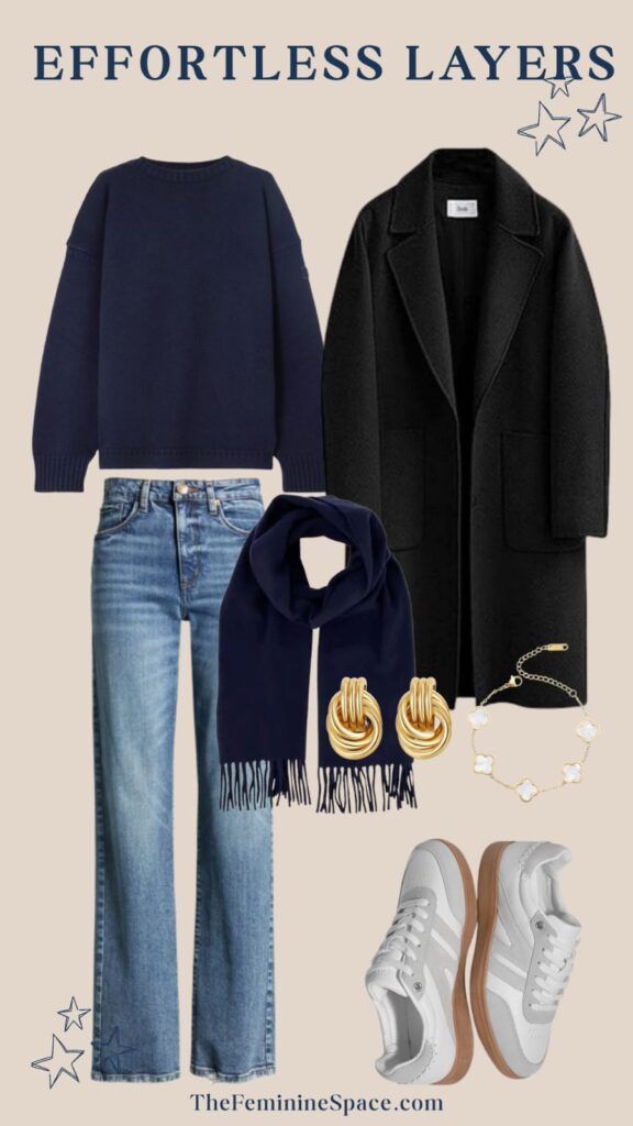Navy Blue Sweater | Straight Leg Jeans | Wool Coat | Knot Stud Earrings | Clover Lucky Bracelet | Navy Blue Scarf | Sneakers