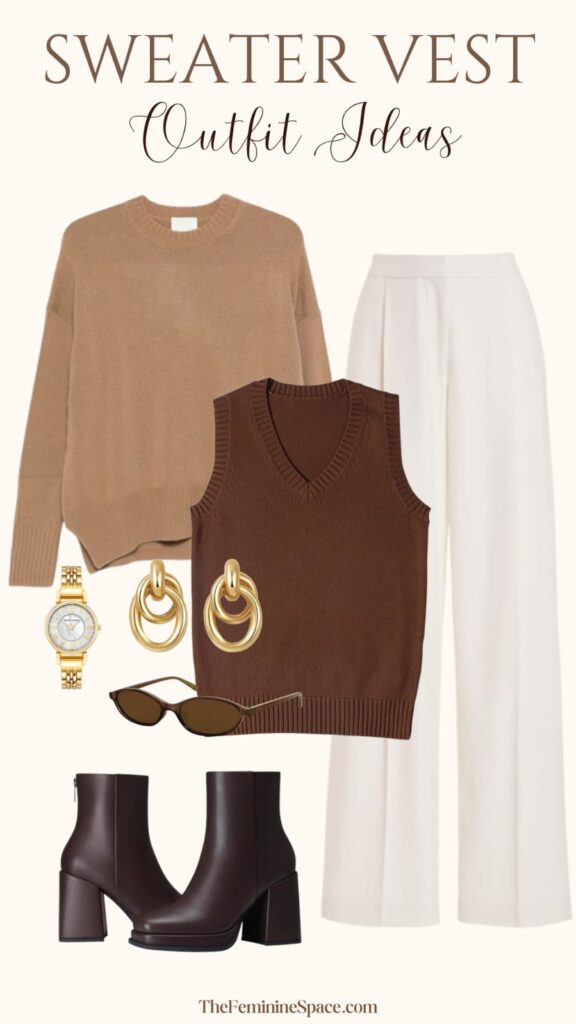 The khaki sweater, deliberately oversized, and the sweater vest layering it together give a beautiful, refined, and cozy look that doesn’t look sloppy at all. When merged with the pristine white pants, it automatically feels elevated and professional, making it a great choice for the workday and work setting.