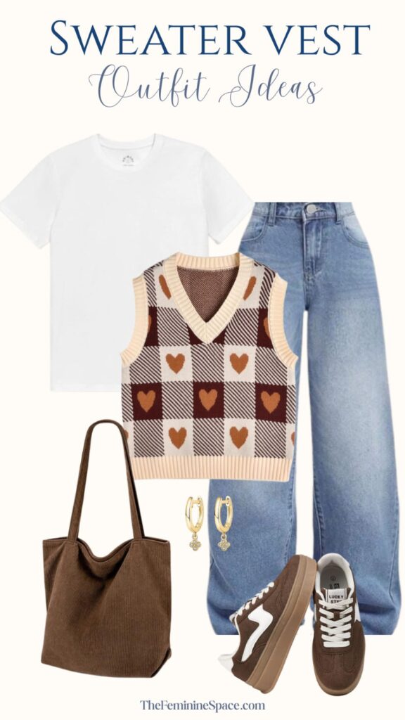 A white tee keeps it simple, while the sweater vest adds personality and warmth. The baggy jeans balance the outfit perfectly, making it casual yet polished. This style looks great in mirror selfies and Instagram flat lays.