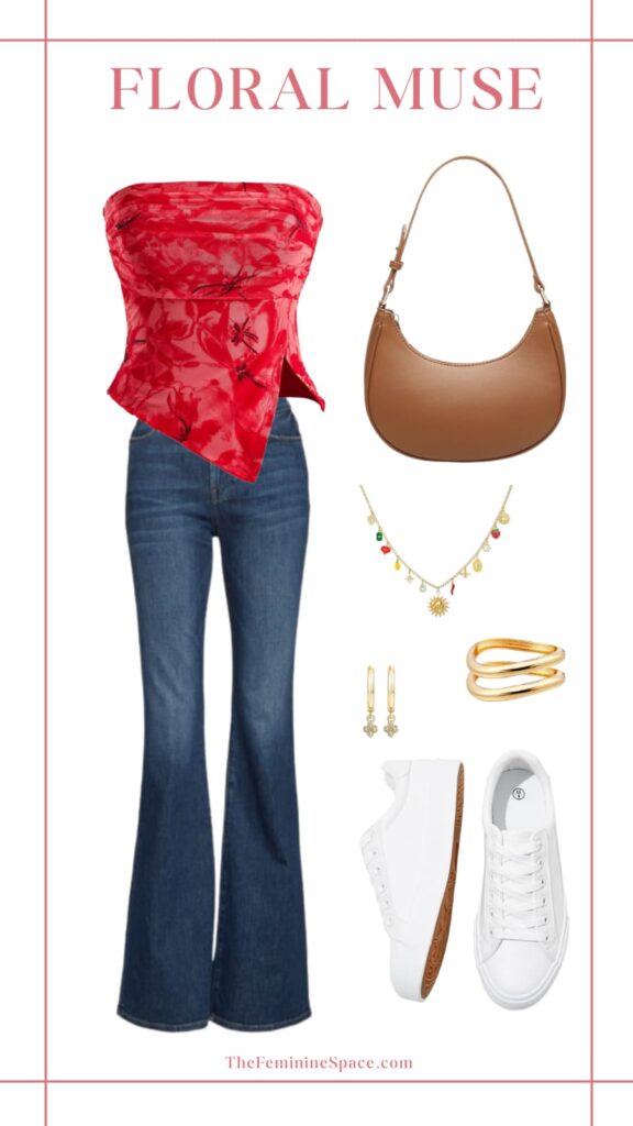 The floral strapless top sets the tone with its feminine, and flirty vibe. It’s lightweight, breathable, and perfect for warm nights under the stars while blue flare jeans balance the look with a flattering, comfy, and versatile fit that makes the outfit feel effortless. A brown shoulder bag adds a warm neutral touch you’ll keep reaching for, while gold huggie earrings bring in dainty sparkle without overwhelming the soft vibe. A whimsical charm necklace and stacked gold bangles provide individual, show stopping touches that glimmer as you move, and the fit is complete with white sneakers that keep you looking great and feeling comfortable all night.