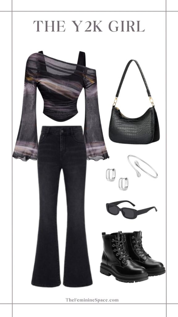 Tapped into your cool girl vibes with an eye catching Y2K top that makes the outfit feel fresh and fun immediately, with black flare jeans that lengthen your legs and look great on anyone. A classic black shoulder bag pulls everything together, with silver hoop earrings and a stacked silver bangle adding a glam touch to the accessories. Completing the outfit, black boots provide just enough edge, providing comfort and a Rockstar feel that’s ideal for dancing or sweeping through the crowd while the retro sunglasses finish the look with that extra Y2K flair perfect for daytime concerts or outdoor festivals.