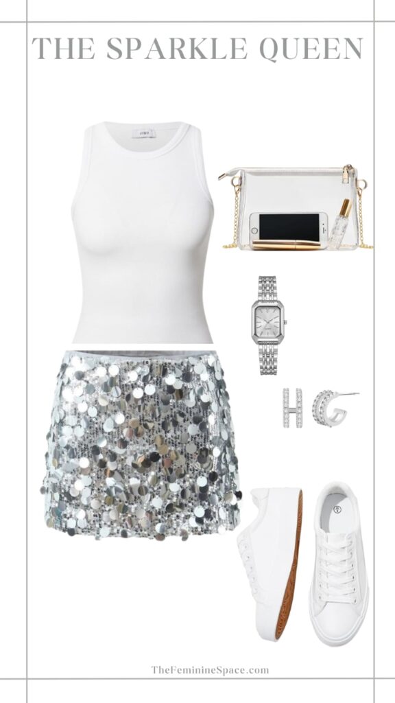 This style is all about balanced glamour, beginning with a simple white crop tank that’s easy and breathable, and a sequin skirt that steals the show with its glittering vibe that shines in the light of the stage. A clear purse keeps the outfit convenient for venue regulations without sacrificing style, and silver earrings add just the right amount of glitz close to your face. Add a sleek silver watch for an urbane sheen, and complete the whole ensemble with crisp white sneakers that are comfortable enough to keep you dancing until the end.