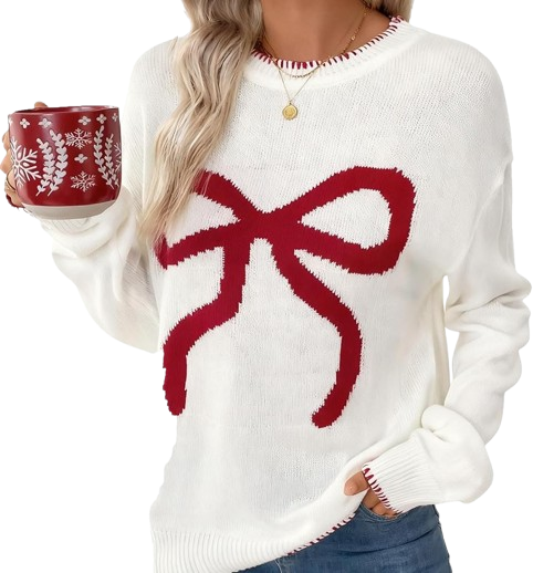 Such a girly, elegant holiday sweater! The bow detailing makes it look sweet and festive, yet not too loud. If you want something feminine that still gives Christmas vibes, this one is perfect. Dress up with a skirt for a holiday brunch or keep it casual with denim.