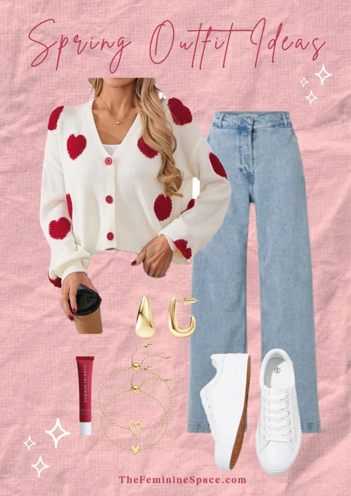 The heart print cardigan makes it playful and feminine. Straight leg jeans are flattering on everyone and gold accessories elevate the whole look. The white sneakers keep it comfy and that pink guava lip balm? The soft glossy finish pulls the entire outfit together.