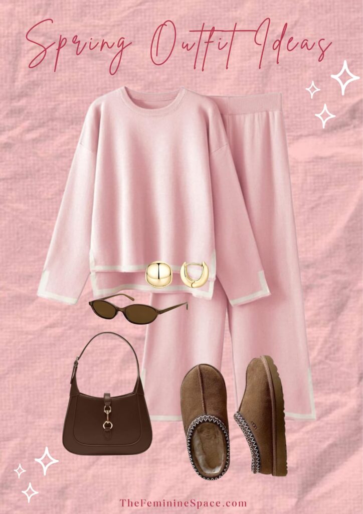 Pink Knit Lounge Set | Gold Thick Hoops | Retro Oval Sunglasses | Brown Shoulder Bag | Uggs