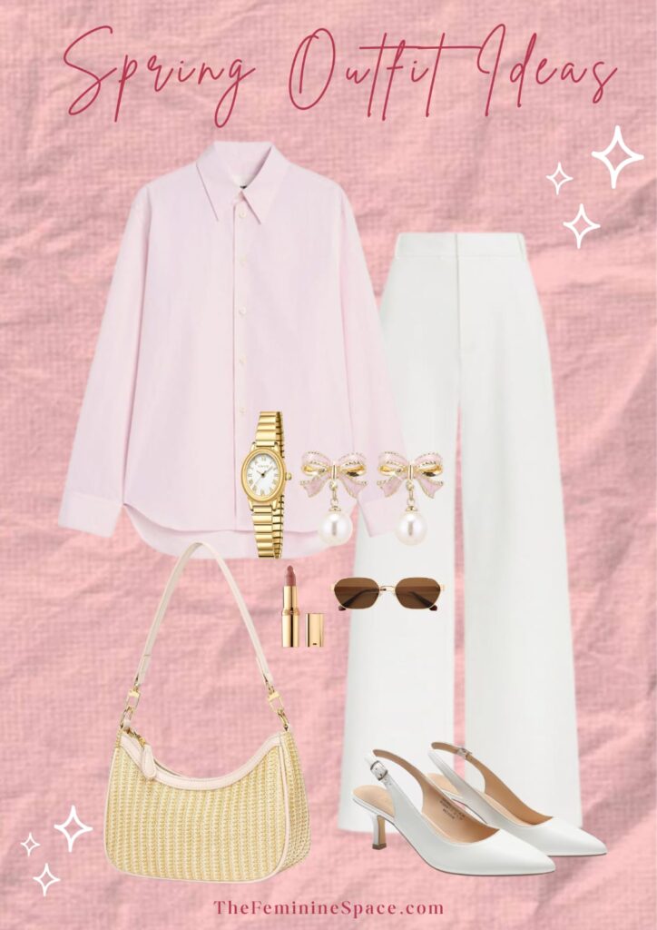A pink button down with tailored white dress pants is the ultimate classy feminine spring outfit.