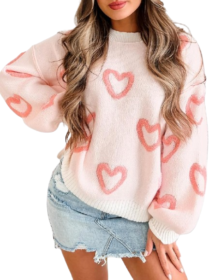 This white sweater with pink hearts captures the Valentine spirit. The oversized fit makes it cozy while the heart print keeps it fun and festive.