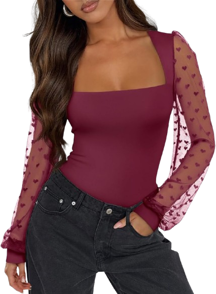 3. Burgundy Heart Sleeve Mesh Bodysuit:
